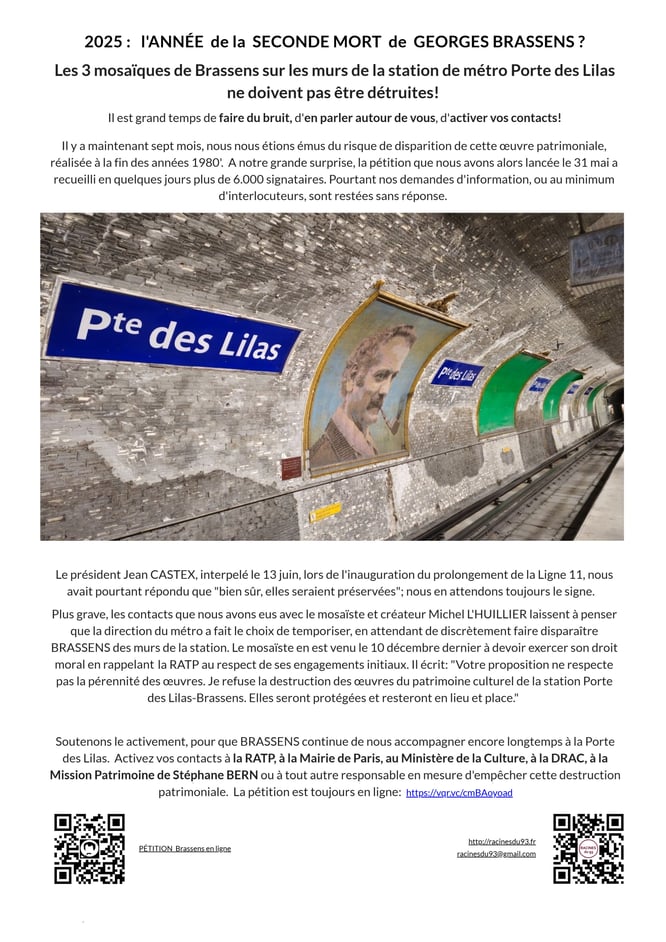 Les actions de Racines 93 ont porté, La RATP a démoli les mosaïques de Brassens, mais nous offre un nouvel emplacement dans la station pour une mosaïque de Brassens.