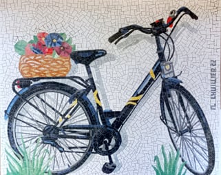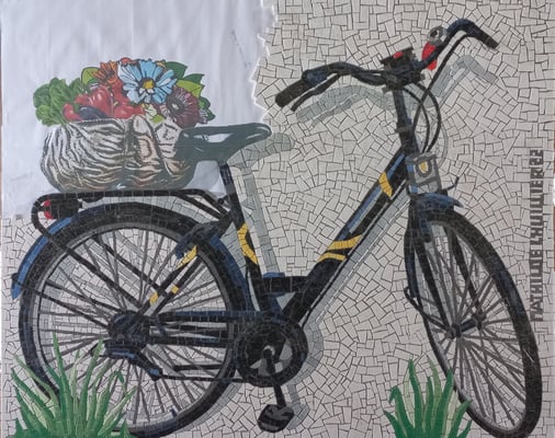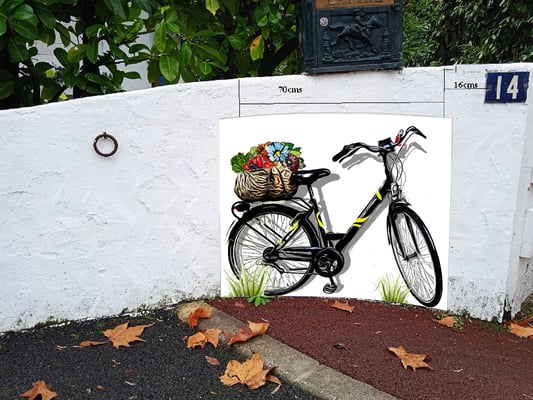Ici le choix de mon client, poser ce vélo que la murette de sa maison comme si le vélo était réel. Je dois pour cela le poser au sol, lui donner une ombre et placer des herbes au sol. Et la petite touche en plus, un panier bien garni. Ci dessous, le vélo fini, prêt à poser.