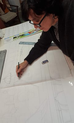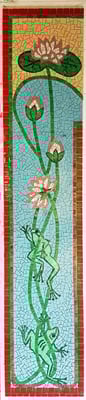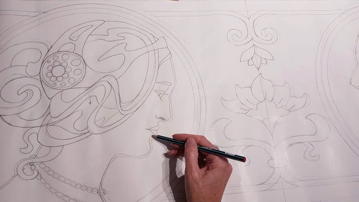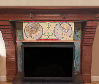 La décoration pour cette cheminée comporte les jambages, le linteau et ses retours. En ce moment, l'Art Nouveau et Mucha ont la cote. Le choix me plaît, les profils féminins sont choisis par mon client, nous ajoutons à cela des graphiques typiques de cette époque pour les jambages sur le thème végétal, nénuphars et grenouilles, ayant pas mal de documentations sur cette période, nous avions du choix. je lui propose des matières mixtes et des couleurs douces. Comme je n'ai pas beaucoup de place, les profils seront simplifiés pour être réalisables. la mosaïque du linteau sera posée directement sur le placo et les jambages pré-colés sur du wedi pour faciliter leur pose sur site.
