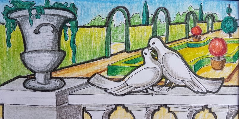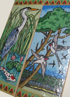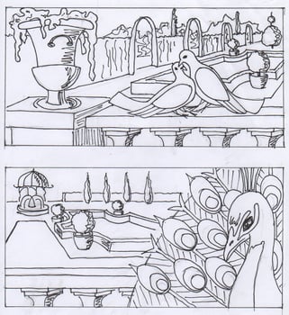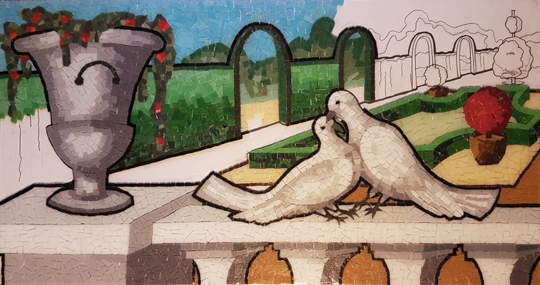 les colombes sont devenues des pigeons Bizet (je crois), choix de dernière minute de mon client. Même si ces panneaux seront séparés, j'ai eu envie qu'ils soient du même dessin.