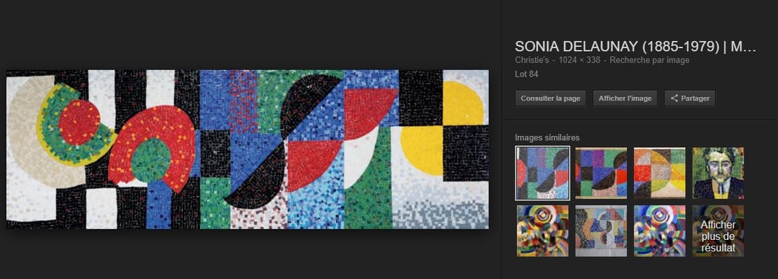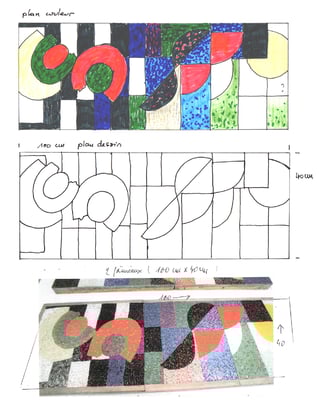 La source de ce projet, les mosaïques de Sonia Delaunay, période Art Moderne. Mon client avait envie d'avoir chez lui une reproduction de l'une de ces mosaïque vu à Paris. mon travail: m'en rapprocher avec des matériaux de maintenant et dans une dimension plus petite.