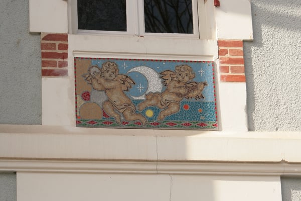 Monsieur Baudoin, amateur d'art, cherche à redonner à cette villa 19° tout son charme en combinant le style de cette époque et ses goûts, ses idées de rénovation le pousse à faire appel appel au savoir-faire de quelques-uns d'entre nous: vitrailliste, ébéniste, ferronnier, mosaïste ... C'est donc avec plaisir que je lui propose des petites scènes en mosaïque pour l'extérieur de cette demeure. Sur chaque façade des petits emplacements décoratifs sont à travailler car trop anciens. Je choisis de lui proposer des sujets dans le style des estampes japonaises et des illustrations art-déco.