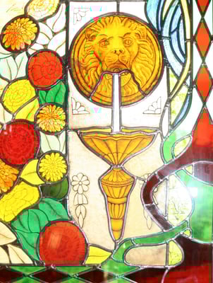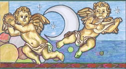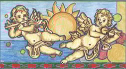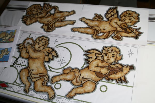 j'ai donc proposé ces deux dessins qui par le fond symbolique (les 4 éléments) relie nos deux idées si différentes. Seul changement, je me permets d'agrandir les angelots pour avoir plus de surface pour travailler. je souligne les éléments par un trait gris pour synthétiser le plomb du vitrail. le travail va être long, beaucoup de petites coupes sont à prévoir.