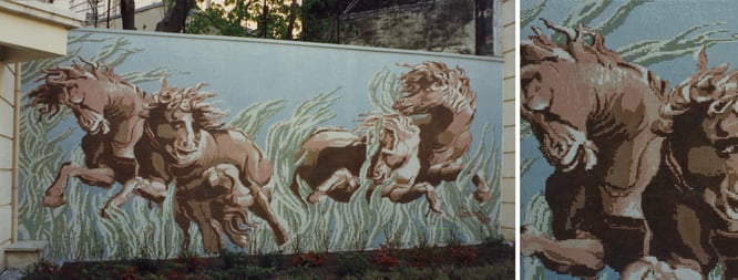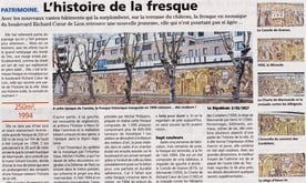 Cette fresque est l'une des plus belle que nous ayons faite en famille pour la région. Un beau souvenir, elle représente très bien la technique en grille, dessinée par ordinateur, de taille imposante, avec au besoin transformations dernière minute, vérification avant expédition, plaques régulières, faciles à mettre en carton pour expédition. (oui! en haut c'est moi il y a 22 ans ).