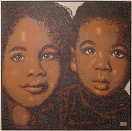 Thilo a aimé le portrait ethnique n°4 au point de me demander de réaliser une fresque pour chez elle de ses deux enfants. Après le choix de la photo, je me lance. Je commence par le petit garçon, la mécanique du départ est bien rodée, étendre le dessin, plastifier parfaitement la table de travail, aligner les couleurs et les outils, m’engoncer dans mon tablier, s’asseoir et démarrer sans réfléchir pince à la main. Couper, assembler, démonter, recommencer et attendre le lendemain pour y voir plus clair et recommencer.