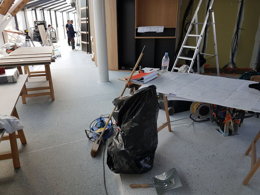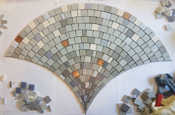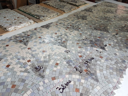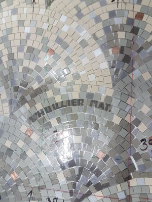 Le projet: travailler sur le thème Odorico et ses écailles, avec une évolution de couleurs douces, d'abord dans les bleus et blancs, choisis par l'architecte (ça n'a pas marché, trop piscine!) puis dans les gris et blancs, là c'était très bien. les écailles devaient être inclinées, petits calculs supplémentaires qui donnent à l'ensemble un coté esthétique indéniable.