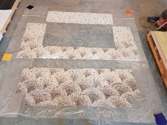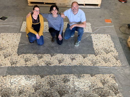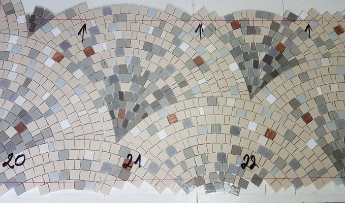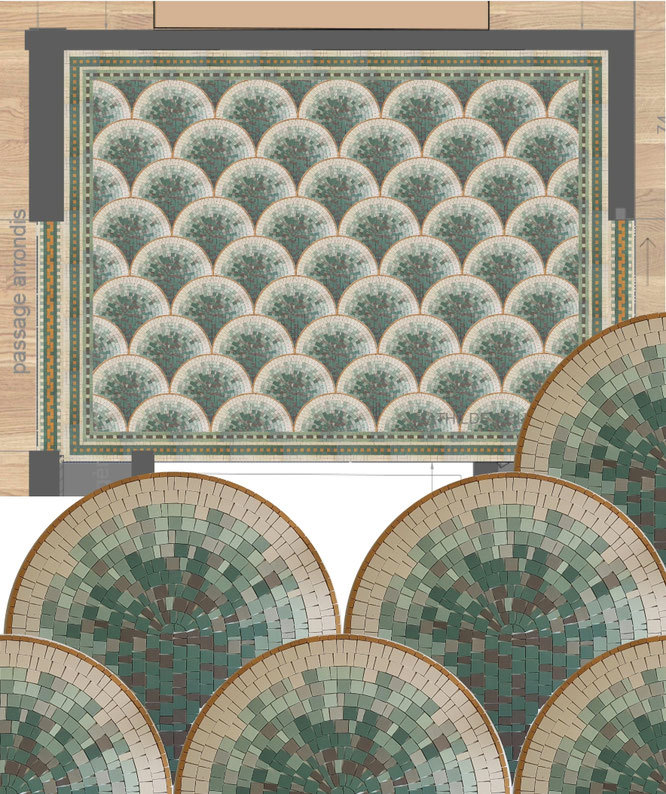 Les Etudes ci-dessous ont évolué au fur et à mesure des corrections, le fond au départ était bronze, mais comme aucune couleur correspondait, nous avons changé d'idée et passé en gris. Le plan de pose montre l'emplacement de chaque plaque 31x31cm.