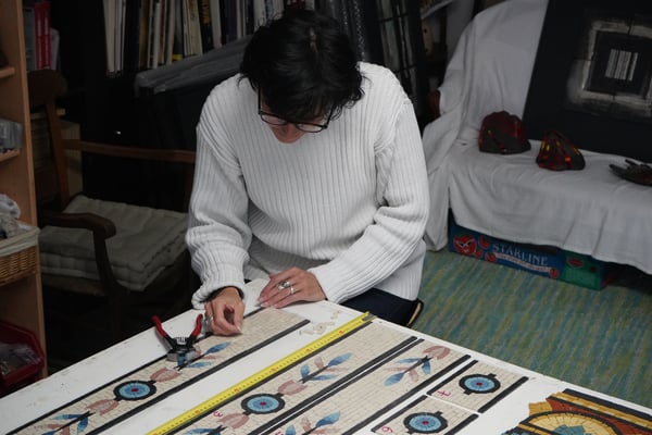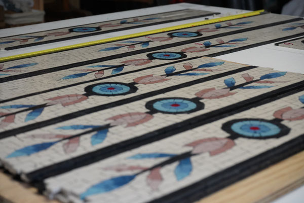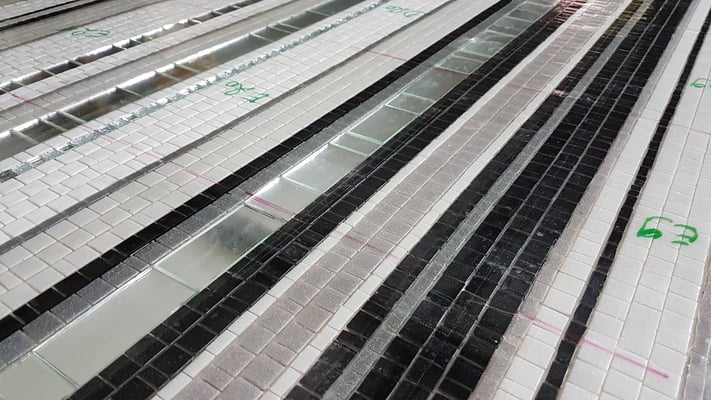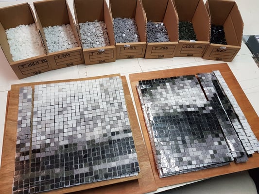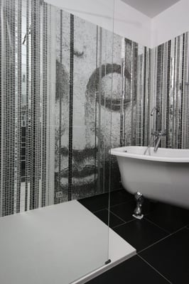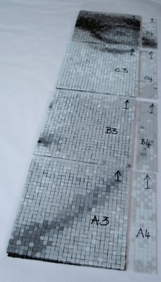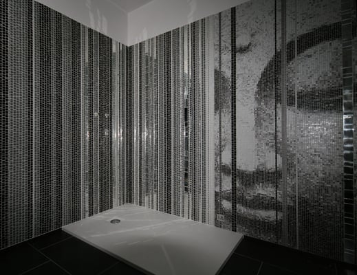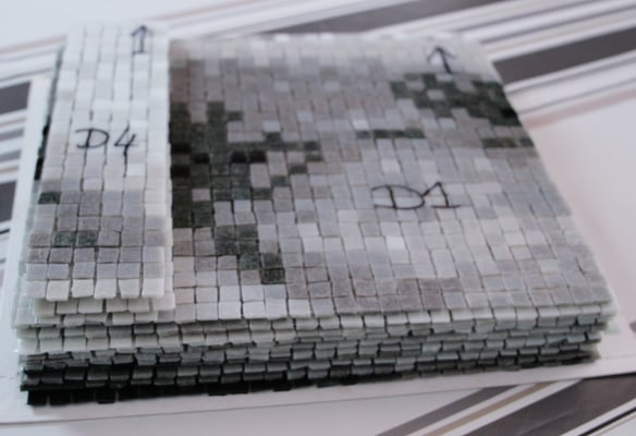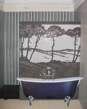 Passer de ces teintes à du noir et blanc donne à la fresque un esprit d'estampe japonaise à l'encre noire diluée. Une couleur mauve et nacrée a été ajoutée pour associer la couleur de la baignoire (qui viendra devant la fresque) aux couleurs des rayures. Je devais avoir là, des teintes de gris bien franches mais au moment de la commande, nous découvrons que Bisazza a réduit sa gamme de pâte de verre 1x1 à son strict minimum. Les rayures et mon dessin s'en sont ressentis, Nous avons fait avec des couleurs gris/marron mais en définitive le rendu est beau, peut être moins baroque, plus harmonieux. Par contre le produit est très bien moulé, ce qui donne un style bonbon aux tesselles.