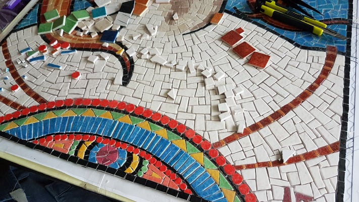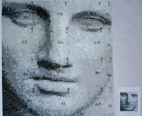 Eric, passionné de mosaïque, a consulté mon site et a vu La Venus, il m'a demandé pour sa salle-de-bain cette fresque, mais plus petite. Pour éviter qu'elle perde en précision, j'ai préféré lui proposer l'image bien serrée sur le visage. je lui ai aussi proposé une autre Venus, mais, son choix est resté sur son premier coup de cœur. Même matière, mêmes couleurs et même section.
