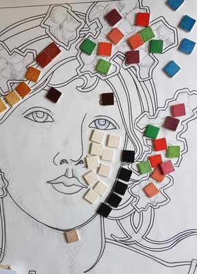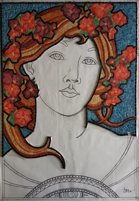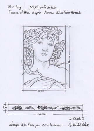 Prochain projet, déjà dessiné, un tableau d'un portrait de Mucha qui sera posé dans une douche italienne et une frise que je retravaillerai après avoir réalisé les fleurs et cheveux de cette image. J'aurai alors les tons et le type de coupe que je pourrai retranscrire sur les fleurs de cette frise. pour l'instant je n'ai pas idée du rendu.