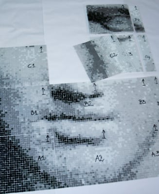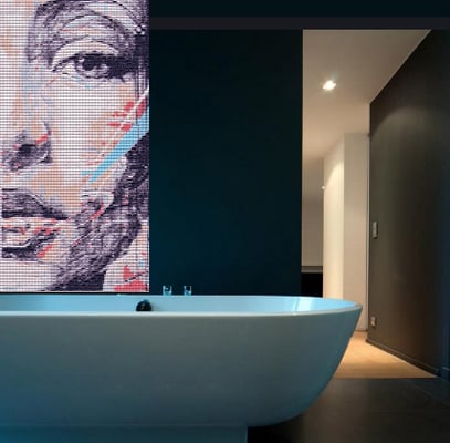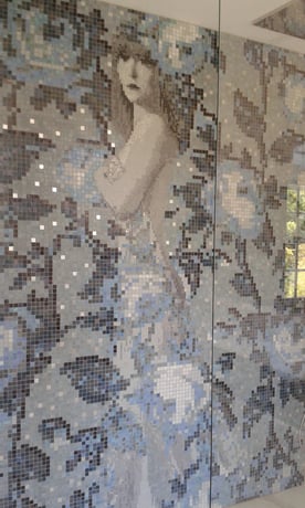 Axel Letellier, architecte Toulousain et sa femme Sophie me commande cette fresque pour leur salle de bain. Ils ont tous deux une attirance pour la mosaïque design comme la présente Bisazza. Axel L. travaille autant dans la réalisation à neuf que dans la rénovation et restauration de monuments anciens, j'ai vu dans son Book qu'il faisait intervenir beaucoup d'artisans de différents corps de métier pour ces travaux.