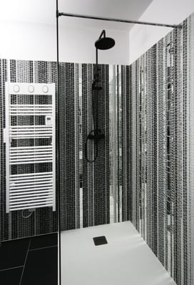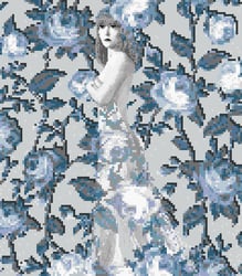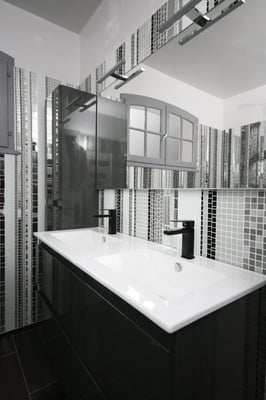 Ici l'idée est de réaliser une image aérienne avec comme sujet une femme et comme fond: une trame florale. Cette femme apparaît, évanescente traversant un rosier délicatement coloré. Nous avons choisi d'utiliser les gammes luxueuses de Bisazza et de Trend. Le reste de la salle de bain sera carrelée de dalles de 1m2 coloris marbre blanc/gris et d'un mobilier design, noir, simple et épuré.