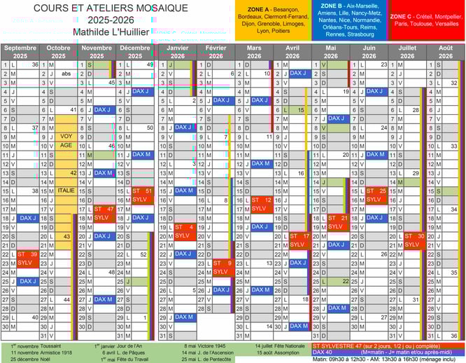 Sur le calendrier, les cases en bleu sont les jeudis cours, DAX M pour les jeudis qu'avec les matins et DAX J pour les jeudis avec journées complètes, dans ce cas vous pouvez choisir de venir toute la journée ou choisir le matin ou l'après-midi, à votre convenance.